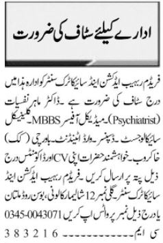 Freedom Network jobs advertisement dated about 28 April 2024 in daily Jang Newspaper invites application for the vacant post of psychiatrist, bawarchi, sweeper, dispenser, cook, clinical psychologist, doctor, ward attendant, medical officer and mbbs doctor in Multan, multan Punjab Pakistan. Educational qualifications required Middle, Matric, Primary, B Pharmacy, MBBS and Intermediate etc.
