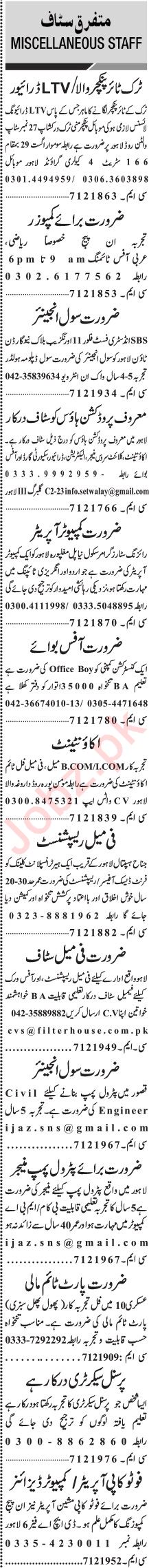 Vacant posts including driver, client service manager, receptionist, office boy, civil engineer, computer operator, front desk officer, truck driver, composer, computer designer, security guard, photocopy operator, ltv driver, female receptionist, accountant, manager, petrol pump manager, mali, engineer, personal secretary, electrician and secretary are announced in Private Company Lahore, lahore Punjab Pakistan as per 29 August 2022 advertisement in daily Jang Newspaper. Preferred Education is Matric, Middle, Bachelor and Intermediate etc.