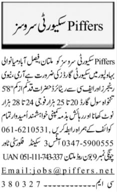 Piffers Security Services Pvt Ltd jobs advertisement dated about 28 January 2024 in daily Jang Newspaper invites application for the vacant post of security staff, civil guard, security guard and fauji guard in Multan, bahawalpur, faisalabad and mianwali Punjab Pakistan. Educational qualifications required Middle, Matric and Intermediate etc.