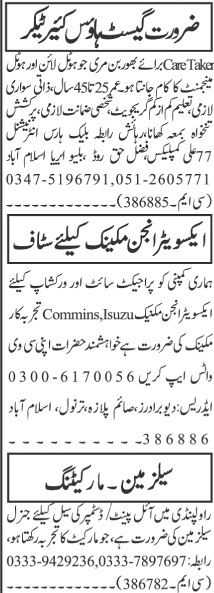 Vacant posts including excavator engine mechanic, salesman and guest house caretaker are announced in Private Company Islamabad, rawalpindi Islamabad Pakistan as per 29 July 2024 advertisement in daily Jang Newspaper. Persons with Bachelor, DAE, Matric, BA and Intermediate etc. education can apply.