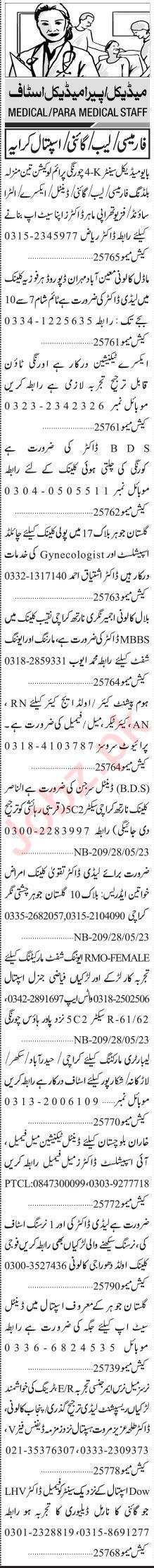 Vacant posts including child specialist, receptionist, bds doctor, dental surgeon, gynecologist, dentist, eye specialist, home patient care, dental doctor, nursing staff, marketing staff, care taker, mbbs doctor, resident medical officer, lady doctor, x ray technician, female nurse, dental technician, lhv, doctor, lady health visitor, rmo and nurse are announced in Hospital Clinic Karachi, sukkur, karachi and hyderabad Sindh Pakistan as per 29 May 2023 advertisement in daily Jang Newspaper. BDS, Matric, MBBS, Bachelor, Others, BA, Intermediate and DAE etc. educational qualification will be preferred.