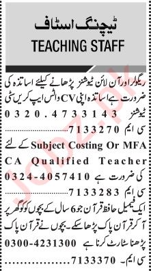 Vacant posts including lady teacher, teacher and quran teacher are announced in Private School Lahore, lahore Punjab Pakistan as per 29 May 2023 advertisement in daily Jang Newspaper. Preferred Education is BA, M.ed, Bachelor, Master, B.ed and M.sc etc.