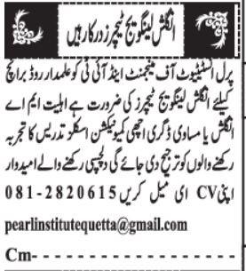 Vacant posts including english language teacher and teacher are announced in Pearl Institute of Management & IT Alamdar Road Quetta, quetta Balochistan Pakistan as per 29 September 2025 advertisement in daily Jang Newspaper. Persons with Master and MA etc. education can apply.