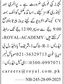Royal Academy Federal B Area Karachi, karachi Sindh Pakistan invites applications from eligible candidates for the post of primary teacher, teacher and secondary teacher as per advertisement of September 29, 2025 published in daily Jang Newspaper. Candidates with Bachelor and Master etc. educational background will be preferred.