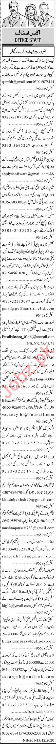 Jang Sunday Classified Ads 28th March 2021 for Office Staff