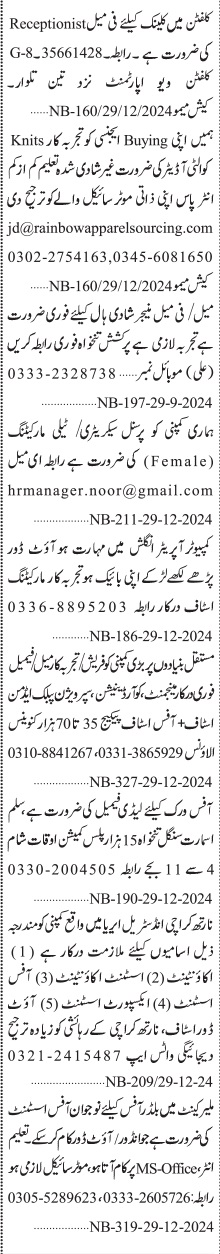 Private Company Lahore, lahore Punjab Pakistan invites applications from eligible candidates for the post of office assistant, admin staff, management staff, assistant accountant, receptionist, telemarketing officer, computer operator, accountant, quality auditor, out door staff, export assistant, banquet hall manager, personal secretary, supervisor and coordination staff as per advertisement of December 30, 2024 published in daily Jang Newspaper. Educational qualifications required Bachelor, BBA, Matric, B.com, BA and Intermediate etc.