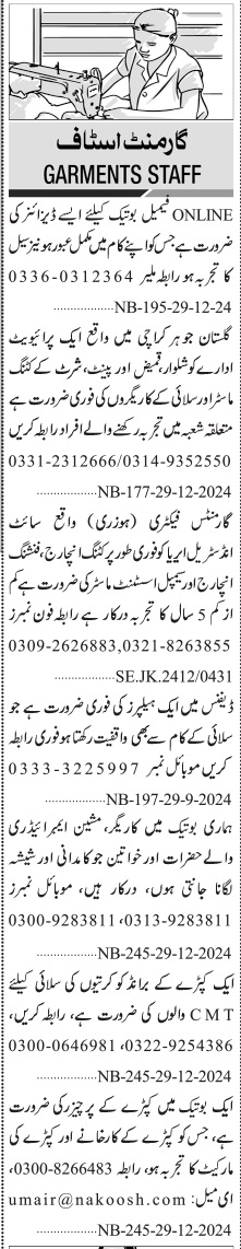 Jang Sunday Classified Ads 29 Dec 2024 For Garments Staff