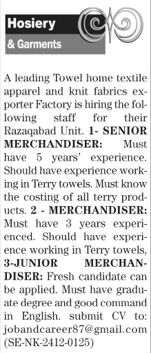 Home Textile Industry is looking for candidates for following posts as per job advertisement published in daily Jang Newspaper of December 30, 2024 for location Karachi, karachi Sindh Pakistan: