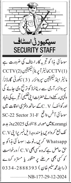Vacant posts including security guard, cctv monitor operator, cctv technician supervisor, security supervisor, technician supervisor and cctv technician are announced in Housing Society Karachi, karachi Sindh Pakistan as per 30 December 2024 advertisement in daily Jang Newspaper. Educational qualifications required Bachelor, Intermediate, DAE, Middle and Matric etc.