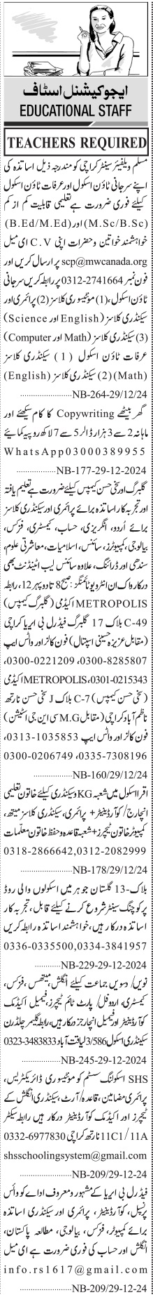 Jang Sunday Classified Ads 29 Dec 2024 For Teaching Staff