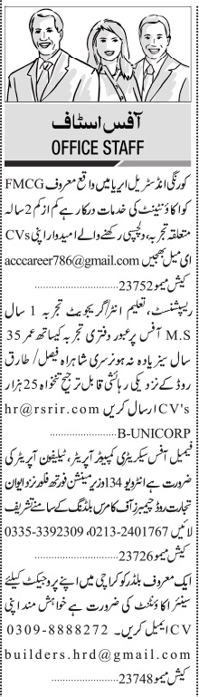 Vacant posts including receptionist, telephone operator, computer operator, office secretary and accountant are announced in Private Company Karachi, karachi Sindh Pakistan as per 30 January 2023 advertisement in daily Jang Newspaper. Middle, Bachelor, Matric and Intermediate etc. educational qualification will be preferred.