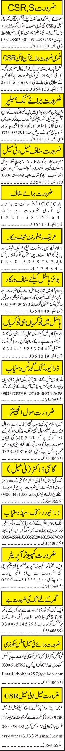 Private Company Rawalpindi, islamabad Punjab Pakistan invites applications from eligible candidates for the post of office secretary, pa, site supervisor, cook, office boy, branch manager, house maid, customer support representative, husband wife, receptionist, csr, maid, female office secretary, governess, chef, helper, qc engineer, batman, quran teacher, gynecologist, ultrasound specialist, electrician, security guard, sweeper, kitchen helper, civil engineer, aya, computer expert, computer operator, qa engineer, lady doctor, cook helper, engineer, personal assistant and doctor as per advertisement of May 30, 2022 published in daily Jang Newspaper. Persons with Middle, Bachelor, MBBS, Others, Matric and Intermediate etc. education can apply.