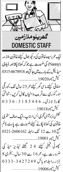 Jang Sunday Classified Ads 29 May 2022 For Domestic Staff