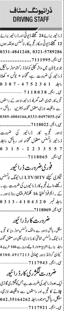 Jang Sunday Classified Ads 29 May 2022 for Driving Staff