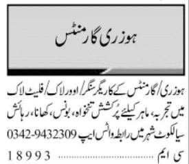 Garments Factory Multan, sialkot Punjab Pakistan invites applications from eligible candidates for the post of over lock machine operator and tailor as per advertisement of May 30, 2022 published in daily Jang Newspaper. Persons with Middle, Matric and Intermediate etc. education can apply.