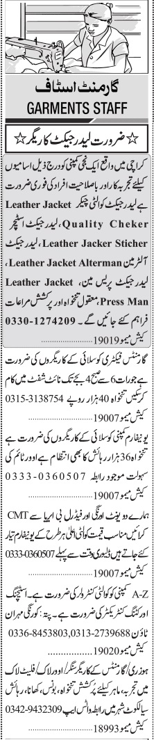 Vacant posts including leather jacket press man, quality controller, leather jacket alterman, worker, leather jacket quality checker, leather jacket sticher and factory worker are announced in Garments Factory Karachi, karachi Sindh Pakistan as per 30 May 2022 advertisement in daily Jang Newspaper. Intermediate, Middle, Bachelor and Matric etc. educational qualification will be preferred.