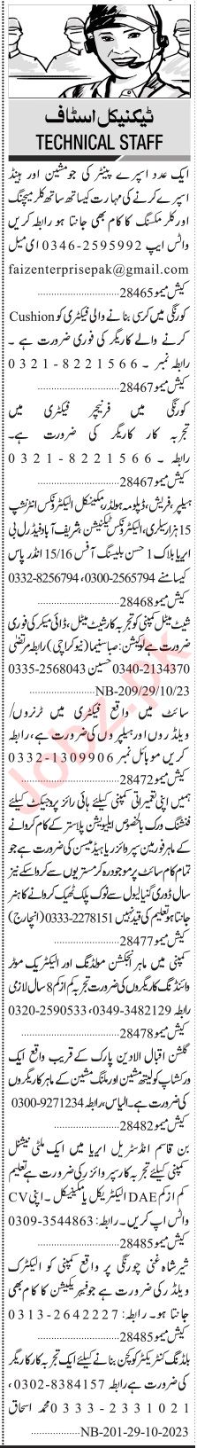 Jang Sunday Classified Ads 29 Oct 2023 For Factory Staff
