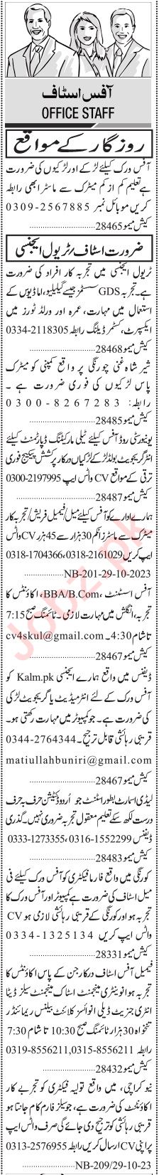 Vacant posts including customer dealer, assistant, computer operator, accountant, stenographer, telemarketing officer, travel tour expert, female office staff, travel agent, office assistant and office staff are announced in Private Company Karachi, karachi Sindh Pakistan as per 30 October 2023 advertisement in daily Jang Newspaper. Candidates with Master, B.com, BA, Matric, BBA, Intermediate, Middle and Bachelor etc. educational background will be preferred.