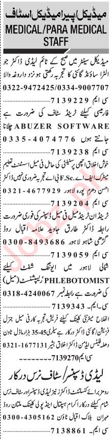 Hospital Clinic invites applications for job positions advertised in daily Jang dated 30 October 2023 for following vacancies in Lahore, lahore Punjab Pakistan.