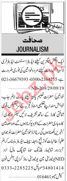 Jang Sunday Classified Ads 29th Sep 2019 for Journalism