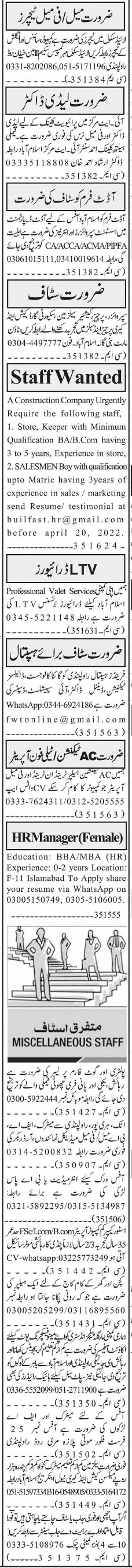 Private Company Islamabad, islamabad and rawalpindi Islamabad Pakistan invites applications from eligible candidates for the post of computer teacher, science teacher, salesman, store keeper, english teacher, poultry farm labor, purchaser, dental doctor, cashier, gynecologist, internee, kitchen helper, dispenser, helper, security guard, doctor, eye specialist, assistant supervisor, ac techncian, supervisor, lady doctor, medical rep, dialysis technician, rider, labor, order booker, nurse, computer operator, female teacher, driver, teacher, account officer, female nurse, office boy, telephone operator, hr manager and ltv driver as per advertisement of April 4, 2022 published in daily Jang Newspaper. Intermediate, Middle, Bachelor and Matric etc. educational qualification will be preferred.