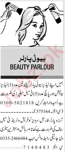 Beauty Parlor invites applications for job positions advertised in daily Jang dated 3 December 2023 for following vacancies in Islamabad, islamabad Islamabad Pakistan.