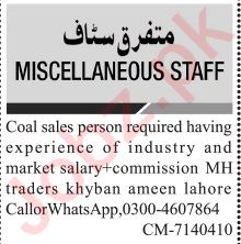 Trading Company jobs advertisement dated about 3 December 2023 in daily Jang Newspaper invites application for the vacant post of sales person and coal sales person in Lahore, lahore Punjab Pakistan. Candidates with Intermediate, BA and Bachelor etc. educational background will be preferred.