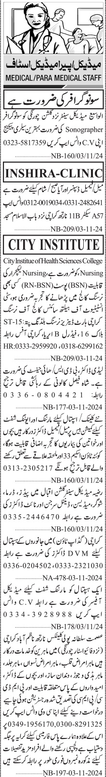 Hospital Clinic Karachi, karachi Sindh Pakistan invites applications from eligible candidates for the post of aya, lecturer, lecturer nursing, doctor, skin specialist, dental surgeon, veterinary doctor, gynecologist, sonographer, dvm doctor, medical officer, dispenser and lady doctor as per advertisement of November 4, 2024 published in daily Jang Newspaper. Persons with Others, Matric, Intermediate, MBBS, Bachelor and BDS etc. education can apply.