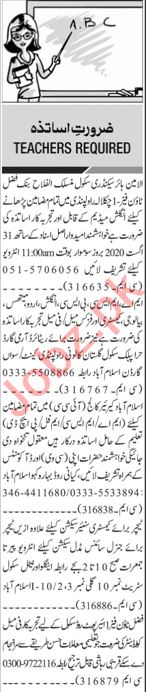 Jang Sunday Classified Ads 30 Aug 2020 For Teaching Staff