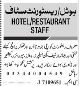 Restaurant jobs advertisement dated about 30 January 2022 in daily Jang Newspaper invites application for the vacant post of kitchen helper, chef, delivery boy, supervisor, cashier and waiter in Lahore Punjab Pakistan. Preferred Education is Middle, Bachelor, Matric and Intermediate etc.