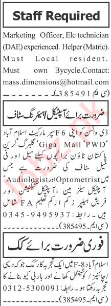 Vacant posts including helper, chinese cook, optometrist, audiologist, marketing officer, electrician, optical salesman and cook are announced in Private Company Islamabad, rawalpindi Islamabad Pakistan as per 30 June 2024 advertisement in daily Jang Newspaper. Candidates with Middle, DAE, Bachelor, Matric, Intermediate and BA etc. educational background will be preferred.