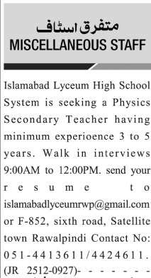 Islamabad Lyceum High School System Satellite Town - 6th Road Rawalpindi, rawalpindi Punjab Pakistan invites applications from eligible candidates for the post of teacher, secondary teacher and physics teacher as per advertisement of December 8, 2025 published in daily Jang Newspaper. Persons with Master and Bachelor etc. education can apply.