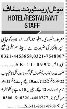 Restaurant invites applications for job positions advertised in daily Jang dated 1 December 2025 for following vacancies in Gulberg Lahore, lahore Punjab Pakistan.