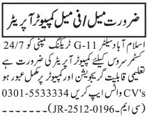 Vacant posts including computer operator and female computer operator are announced in Vehicle Tracking Company G-11 Islamabad, islamabad Islamabad Pakistan as per 8 December 2025 advertisement in daily Jang Newspaper. Bachelor etc. educational qualification will be preferred.