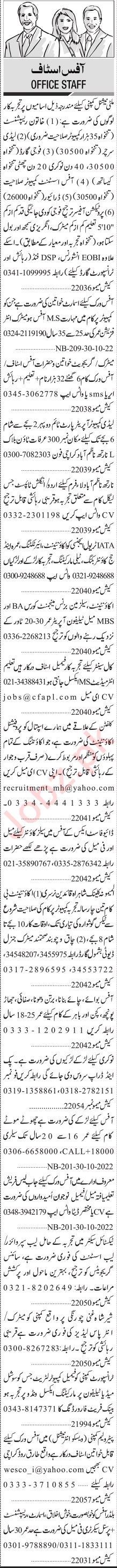 Private Company Karachi, karachi Sindh Pakistan invites applications from eligible candidates for the post of ltv driver, female receptionist, salesman, office boy, typist, office assistant, receptionist, telemarketing officer, lab supervisor, protection officer, telephone operator, social media officer, lab assistant, accountant, computer operator, personal secretary, call center agent, fauji guard, lady searcher, accounts officer and driver as per advertisement of October 31, 2022 published in daily Jang Newspaper. Candidates with Middle, Intermediate, Matric and Bachelor etc. educational background will be preferred.
