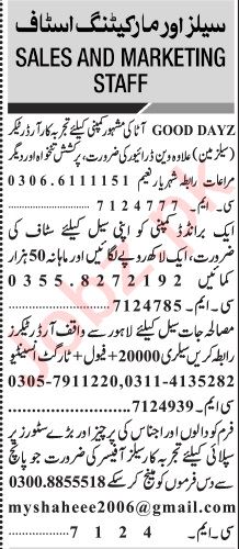 Marketing Company Lahore, lahore Punjab Pakistan invites applications from eligible candidates for the post of sales staff, sales officer, van driver, order taker, driver and salesman as per advertisement of October 31, 2022 published in daily Jang Newspaper. Persons with Matric, Middle, Bachelor and Intermediate etc. education can apply.