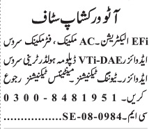 Auto Workshop Lahore, lahore Punjab Pakistan invites applications from eligible candidates for the post of service advisor, trainee service diploma holder, maintenance technician, fitter, efi electrician, ac mechanic and electrician as per advertisement of September 1, 2025 published in daily Jang Newspaper. Intermediate, DAE, Matric and Middle etc. educational qualification will be preferred.