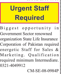 State Life Insurance jobs advertisement dated about 1 September 2025 in daily Jang Newspaper invites application for the vacant post of sales staff, insurance agent, insurance staff and marketing staff in Lahore, lahore Punjab Pakistan. Intermediate etc. educational qualification will be preferred.