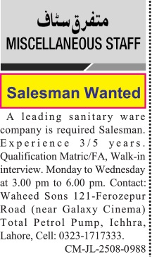 Waheed Sons Ichhra Lahore, lahore Punjab Pakistan invites applications from eligible candidates for the post of salesman and sales staff as per advertisement of September 1, 2025 published in daily Jang Newspaper. Educational qualifications required Intermediate and Matric etc.