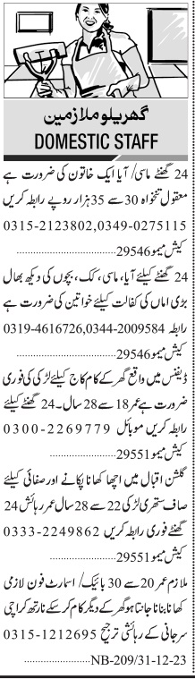Jang Sunday Classified Ads 31 Dec 2023 For House Staff