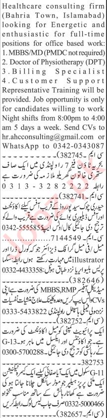Vacant posts including graphic designer, mbbs doctor, doctor, delivery boy, camera technician, csr, customer support representative, masi, house worker, maid, medical officer, accountant, lady doctor, billing specialist, aya and doctor of physiotherapy are announced in Private Company Islamabad, rawalpindi Islamabad Pakistan as per 31 March 2024 advertisement in daily Jang Newspaper. Matric, Others, Middle, MBBS, B.com, BA, Bachelor, ACCA, DAE, BBA, DPT and Intermediate etc. educational qualification will be preferred.
