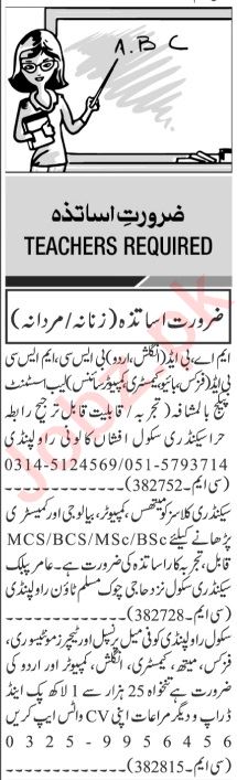 Private School invites applications for job positions advertised in daily Jang dated 31 March 2024 for following vacancies in Islamabad, rawalpindi Islamabad Pakistan.