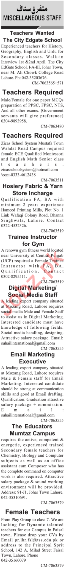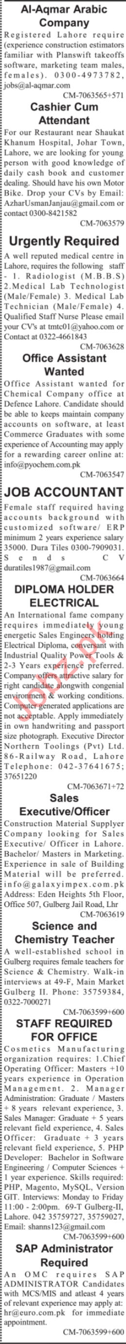 Computer Operator, Call Operator, Telephone Operator, Receptionist, Clerk, Admin Manager, Teacher, English Teacher, Chemistry Teacher, Physics Teacher, Coordinator, Biology Teacher, Maths Teacher, Urdu Teacher, Admin Officer, Assistant Manager, Clerk, Security Guard, Driver needs in well reputed companies.
