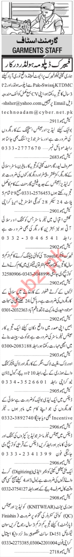 Salesman, Tailor Master, Merchandiser, Quality Controller, Ladies Helper, Incharge Supervisor, Stitching Reporter, Factory Accountant, Assistant Manager Production, Cutting Incharge, Machine Operator, Special Machine Operator, Floor Incharge, Quality Auditor, Loader, Pattern Master, Sample Master, Finishing Incharge, Packing Folders, Back Process Technician, Receptionist, Data Feeder, Data Entry Operator, Electrician and Maintenance Incharge seeks in well known factories.