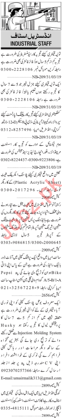 Jang Sunday Classified Ads 31st March 2019 Industrial Staff