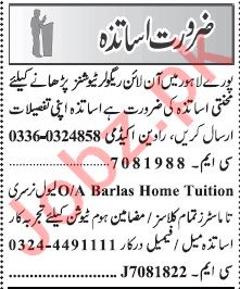 Quran Teacher, English Teacher, Chemistry Teacher, Physics Teacher, Coordinator, Biology Teacher, Maths Teacher, Urdu Teacher, Art Teacher, ESL Teacher, High School Teacher, History Teacher, Kindergarten Teacher, Middle School Teacher, Montessori Teacher, Music Teacher seeks in well known schools.