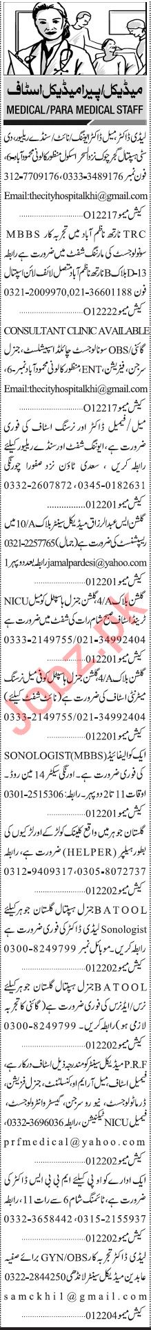 Skin Specialist, Medical Specialist, ENT Specialist, Eye Specialist, Child Specialist, Medical Officer, Radiologist, Nurse, LHV, Doctor, Lady Doctor, Pharmacist, Midwives, Gynecologist, Receptionist, Dispenser, Resident Medical Officer, Pathologist, General Manager, Admin Assistant, Executive Officer, Manager Housekeeping, Assistant Chemist, ICU Technician, CT Scan Technician, X Ray Technician, House Officer, Nursing Instructor, CCTV Assistant, Lab Technician needs in well reputed hospitals.
