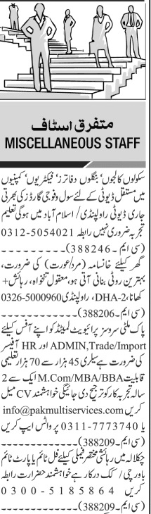 Vacant posts including hr officer, fauji guard, civil guard, cook, bawarchi, khansama, security guard, admin officer and import officer are announced in Private Company Islamabad, rawalpindi Islamabad Pakistan as per 5 August 2024 advertisement in daily Jang Newspaper. Preferred Education is M.com, BBA, Middle, Matric, MBA, Intermediate and Bachelor etc.