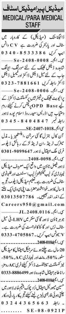 Hospital Clinic Lahore, lahore Punjab Pakistan invites applications from eligible candidates for the post of doctor, dentist, lhv, staff nurse, gynecologist, general surgeon, lab assistant, nurse, dental doctor, lab technician, specialist doctor, phlebotomist, medical consultant, lady doctor and helper as per advertisement of August 5, 2024 published in daily Jang Newspaper. Intermediate, DAE, Matric, Bachelor, MBBS and BDS etc. educational qualification will be preferred.
