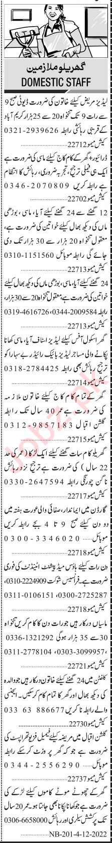 Jang Sunday Classified Ads 4 Dec 2022 For House Staff